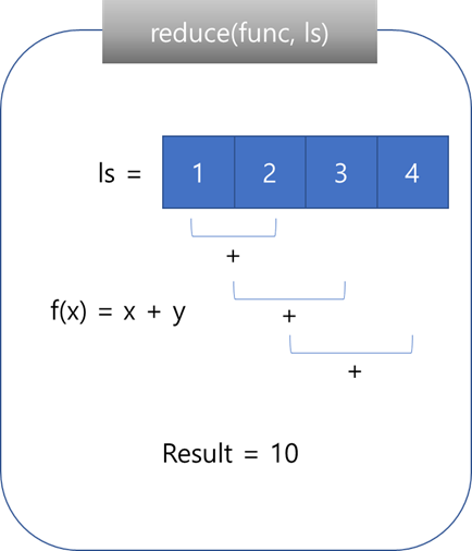 ○ reduce() : 리스트 데이터를 처음부터 순서대로 특정 함수를 실행하여 결과를 누적시켜 주는 함수